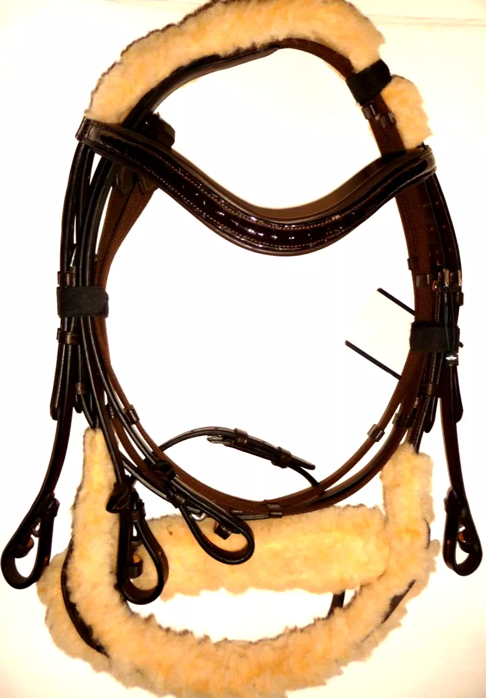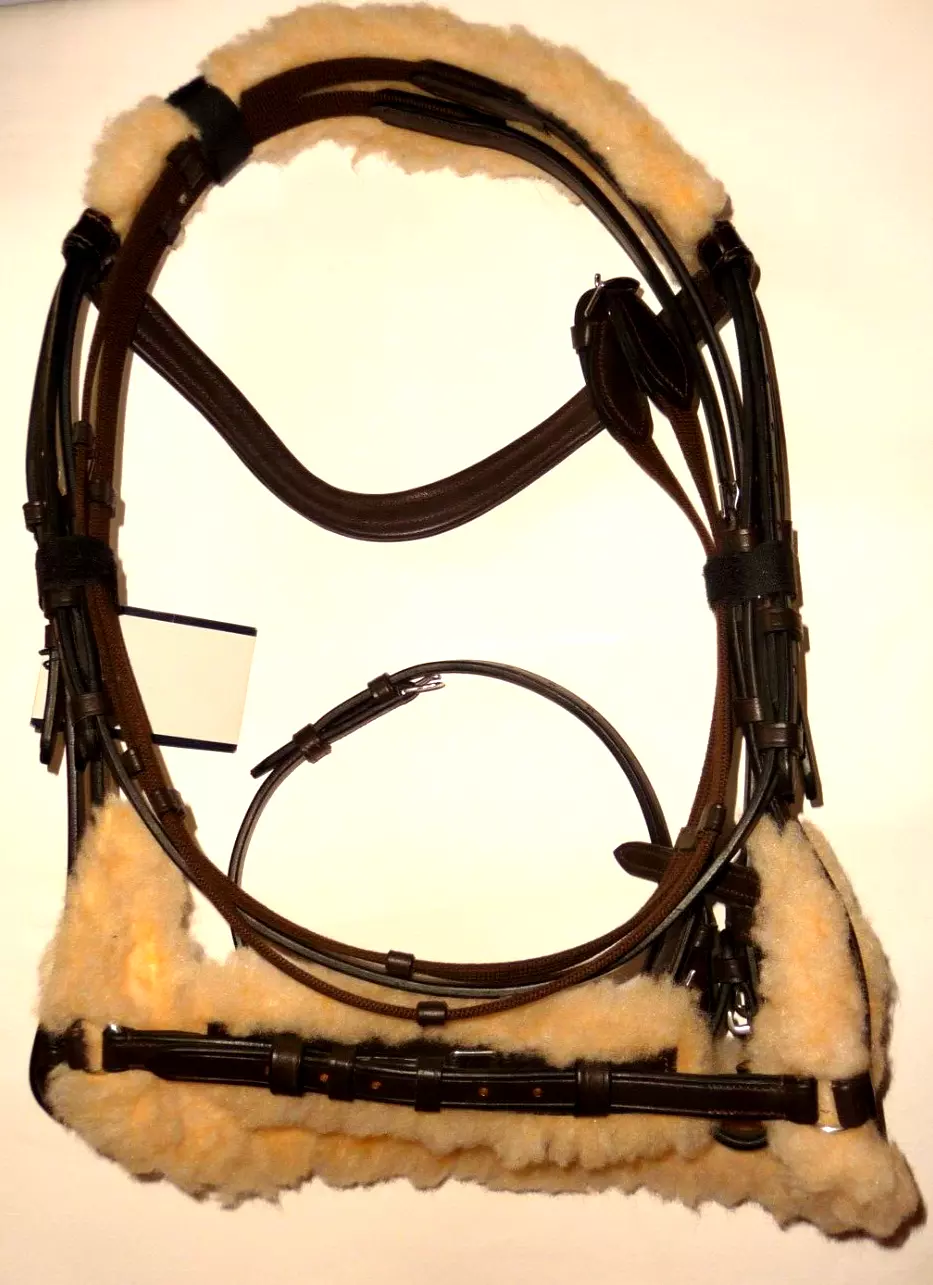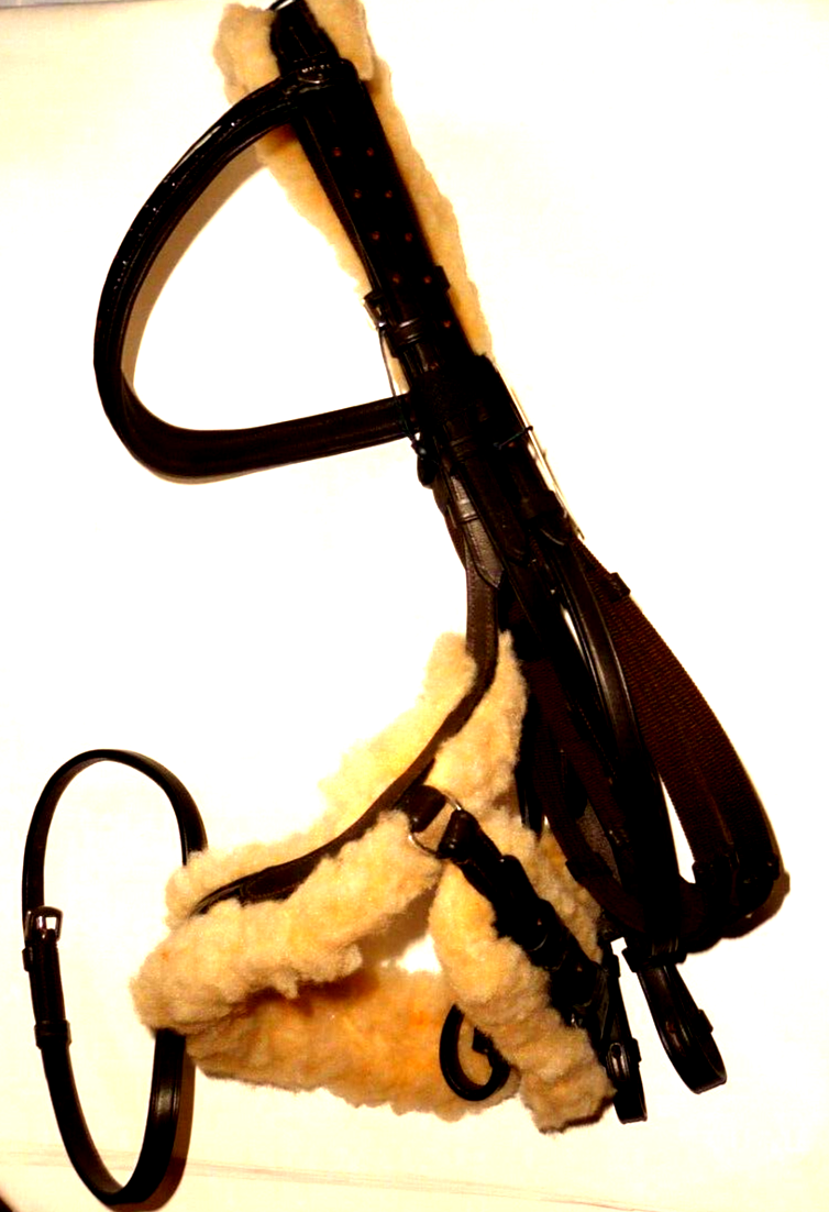 Schwedische Trensenzaum mit Kunstfellfutter unter dem Nasenriemen und dem Genickstück.